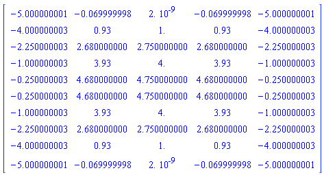 The first argument to ArrayInterpolation is a list of the lists of the independent coordinates. The second argument is the matrix of known heights. The third argument defines the "target," that is, the points at which "new" function values are to be calculated. Ordinarily, this would be an Array with the coordinates of many points. Here, it consists of the coordinates of a single point, . Thus,  is the interpolated height at the single point .
