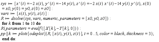 The use of the parameters option in dsolve/numeric simplifies changing the initial conditions for each ascent curve. Before the resulting numerically determined curve can be graphed, the intervening line that defines a set of parameters must be executed. Surprisingly, this invocation must be in terms of floats - hence, the evalf command.