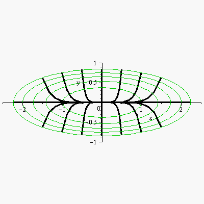 Steepest-ascent curves from any point on the ellipse  are integral curves of the gradient field . , itself everywhere orthogonal to the level curves for the function. With , we can use the interactive task template in Table 1 to obtain a graph of the flow lines of the gradient field. After entering the appropriate data, simply click on a point through which an integral curve is to be drawn. Constrained (one-to-one) scaling is imposed with the Context Menu.