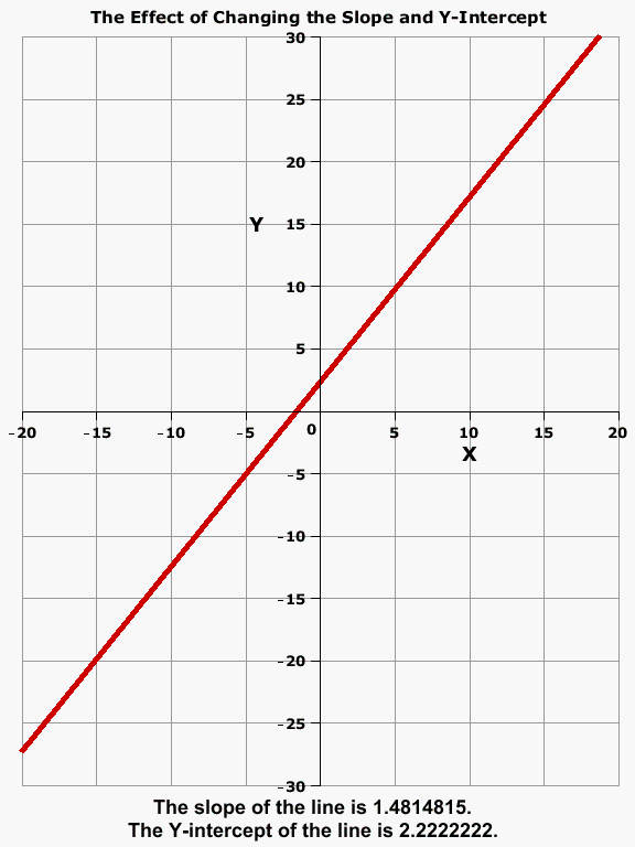 The plot above is dynamic, and demonstrates how a line changes as its slope and y-intercept vary over a range of values from -30 to 30. It's fun and very educational. The first slider controls the y-intercept of the line. The second slider controls the slope or amount of "slantiness" you might say. The meter changes the color, but you won't notice any change in the color of the line until you start playing with one of the first two sliders. Enjoy!!!