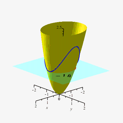 Solución: En la figura de abajo puede observar la gráfica de la función , el cilindro y la curva de intersección de ambas superficies. Recuerde que haciendo clic sobre la figura y luego presionando el botón puede rotar la figura. Observe que el eje azul es el correspondiente al eje , mientras que el eje negro es el correspondiente al eje .