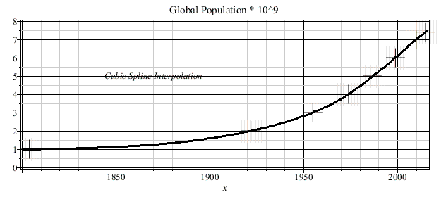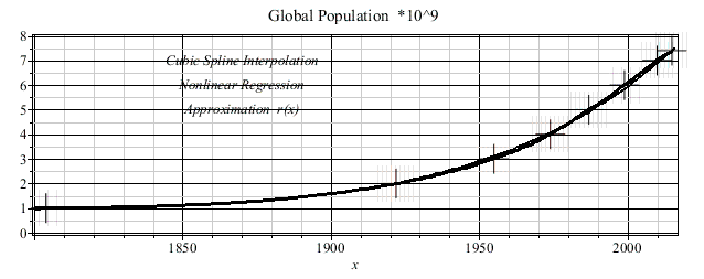 This worsheet is concerned with the development of the global population during the period of 1804 - 2015. In 1804 or 2015 the population is 10^9 or 7.4*10^9, respectively. The given data has been interpolated by the cubic spline function.