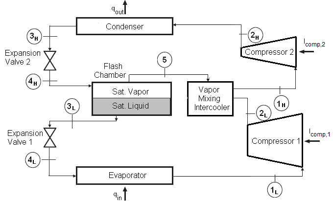 In the event that a high COP of a refrigeration cycle is of greater importance compared to other factors, it is possible to significantly increase the COP of a basic cycle through the use of a multistage vapor compression cycle. This is especially true when the pressure ratio between the heat rejection and heat absorption pressures is large 5 or more. Multistaging involves one or more intermediate pressures between the heat rejection and heat absorption pressures, and a series of compressors operating between successive pressure intervals. One type of multi-compressor vapor compression cycle includes a mixing chamber where saturated vapor from the flash chamber mixes with the vapor leaving the low pressure stage compressor. This vapor-mixing chamber acts as a regenerative intercooler since it cools the superheated vapor leaving the low-pressure stage compressor using lower temperature saturated workin fluid, mixing the two prior to the next stage of compression.