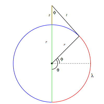 Figure 1 illustrates what happens if, at one point, the band of circumference C[1] is lifted as high as possible. The red arc, measured by angle theta, has length lambda = r*theta and r*theta = r*(phi+(1/2)*Pi). The height of the lifted point above the surface of the earth is denoted by s, and the segment not in contact with the earth, tangent at the point where the band leaves the surface, has length t. The radius to this point of last contact is orthogonal to the tangent, and makes an angle phi with the horizontal.