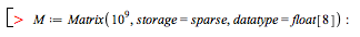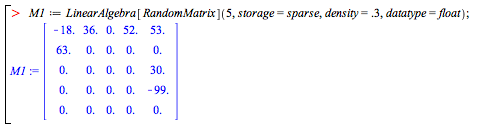 Since there is no apparent structure in this matrix, except for the fact that 90% of the entries are zero, a general sparse matrix is appropriate. There are two general formats for Array, Matrix, and Vector creation in Maple that are specified with the option storage=sparse. One format, for Arrays, Matrices, and Vectors with a non-hardware datatype, uses a hash table to store index/value pairs. Insertion and lookup are very fast, as is unordered data traversal. The other, for hardware datatypes, matches the format used by the Numerical Algorithms Group (NAG) libraries. In this format, vectors are used to store the index and column coordinates, lined up with a value vector.