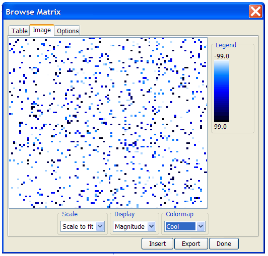 After creating the matrix, you can browse it by double-clicking on the output summary. Viewing the matrix entries using a magnitude map, you can see the locations in the matrix where the entries are zero (shown in white)