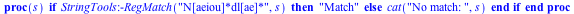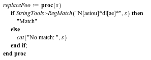 In particular, many of the advanced tools for string processing in Maple can be translated to Perl equivalents.  The following Maple code uses the StringTools[RegMatch] command for string matching with regular expressions.