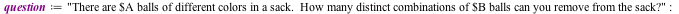 The sutdent can click the "Try Another" button a few times to see how the variables inside the question change. Inside Maple, a student can explore calculations. One may discover the expression palette has the choose notation. For removing two balls from a bag of eight, you could compute: