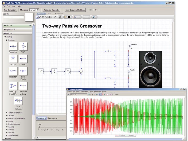 A crossover circuit is essentially a set of filters that directs signals of different frequency ranges to loudspeakers that have been designed to optimally handle those ranges. This two-way crossover circuit is typical for domestic applications, such as stereo speakers, where the lower frequencies (< 1 kHz) are sent to the larger "woofer" speaker and the high frequencies (>1 kHz) to the smaller "tweeter".