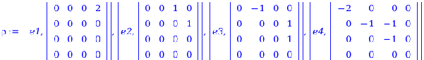 M≔Matrix⁡0,0,0,2,0,0,0,0,0,0,0,0,0,0,0,0,Matrix⁡0,0,1,0,0,0,0,1,0,0,0,0,0,0,0,0,Matrix⁡0,−1,0,0,0,0,0,1,0,0,0,1,0,0,0,0,Matrix⁡−2,0,0,0,0,−1,−1,0,0,0,−1,0,0,0,0,0: