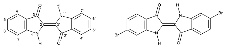 Figure 1: Structures of indigo (left) and tyrian purple (right).