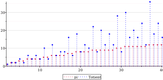 The PrimeCounting(n) (or pi(n)) command returns the number of primes less than an integer n. The following plot compares pi(n) with phi(n) for the first 40 values for n: