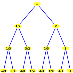 The vertices of the Calkin-Wilf tree are labeled with rational numbers ab. The root vertex is defined to be 11  and for any vertex ab, its children are aa+b and a+bb. Every positive rational number occurs exactly once in the Calkin-Wilf tree.