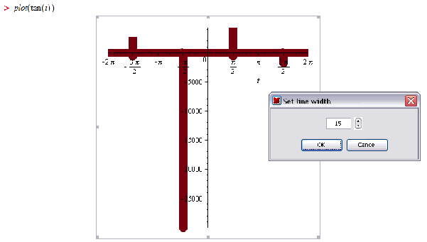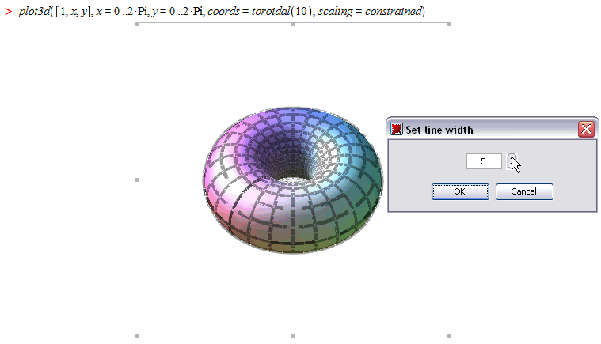 When using the plot and plot3d commands, line width can be set using the thickness=n option. The value of n can be any positive integer. For details, see plot[options] and plot3d[option].