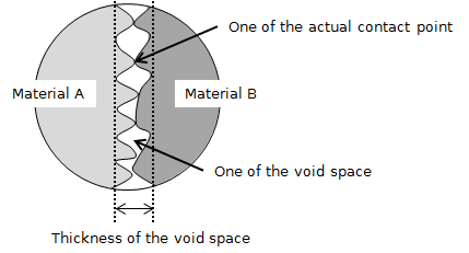 Because of the surface roughness of both materials, the actual contact area of two materials becomes spots of contact. The other areas are regarded as the void space filled by fluid such as air. The following image illustrates the mechanism of jointed surface in more detail.