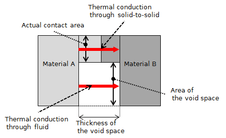 The Thermal Contact Resistance component models a heat transfer between two materials which have different thermal conductivities. The following image illustrates an example of apparent contact area of two materials.