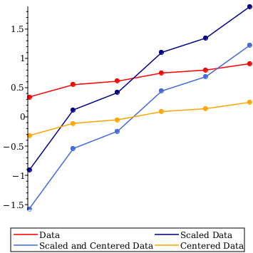 The red line shows the original data and the orange line shows the data minus the center value. The dark blue line shows the data divided by the scale value (the standard deviation) and the light blue line shows the data minus the center then divided by the scale value.