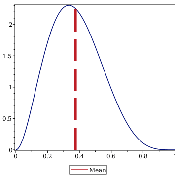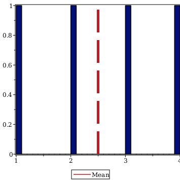 The Mean function computes and/or plots the arithmetic mean of the specified random variable or data set. This is the same as the expected value of the random variable. The same command can be obtained as  ExpectedValue.