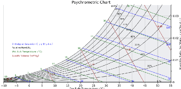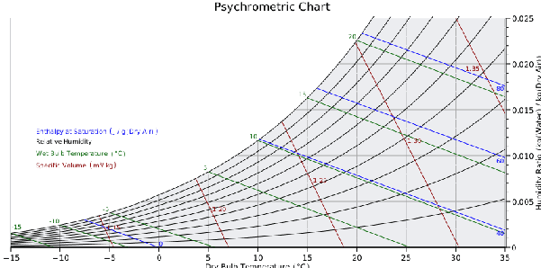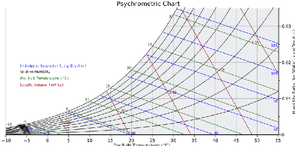 The PsychrometricChart function generates a plot with constant relative humidity curves in humid air, with the dry bulb temperature on the horizontal axis and the humidity ratio on the vertical axis. Three additional sets of lines can be drawn on this plot: for constant specific volume per dry air, constant wet bulb temperature, and constant saturation enthalpy.