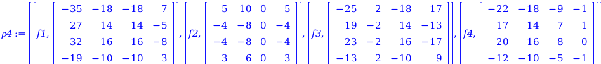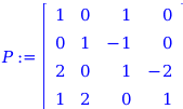 P := Matrix([[1, 0, 1, 0], [0, 1, - 1, 0], [2, 0, 1, - 2], [1, 2, 0, 1]]);