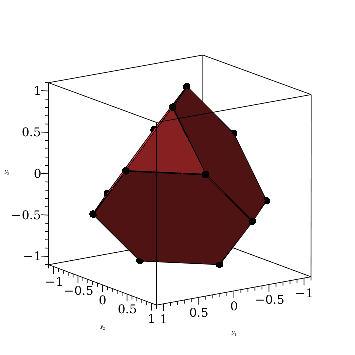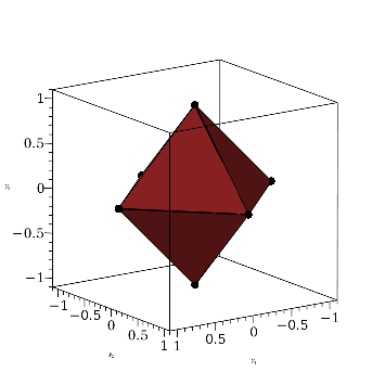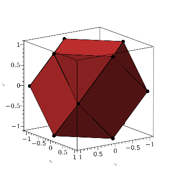 The Tetrahedron, Cube, Octahedron, TruncatedTetrahedron, TruncatedOctahedron, and Cuboctahedron commands create polyhedral sets in three dimensions.  The calling sequence with no arguments, SetName(), uses the default coordinates for the set's ambient space.  Alternatively, the coordinates can be specified via SetName(coords) or generated as indexed variables with variable varname as their root via SetName(varname).