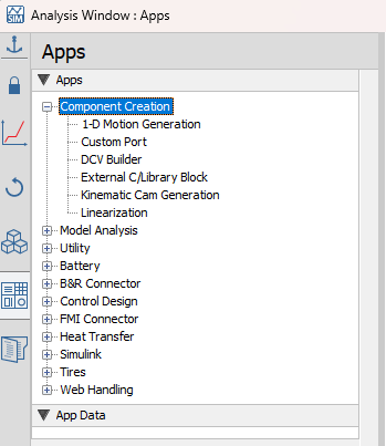 Contains expandable menus with tools that you can use to build a model and manage your MapleSim project. This pane contains five tabs: