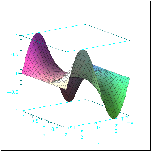 Explore plot3d sina*x*y^2, x = Pi..Pi, y = 1..1, axis = color=cyan, view = 1..1 ,                 a = 1..5, componentbackground = Black, fillcolor = LightBlue, fontcolor = DarkBlue