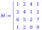 M := Matrix([[1,2,4,1],[2,4,1,2],[6,5,2,7],[1,2,0,9]]);