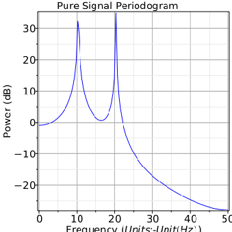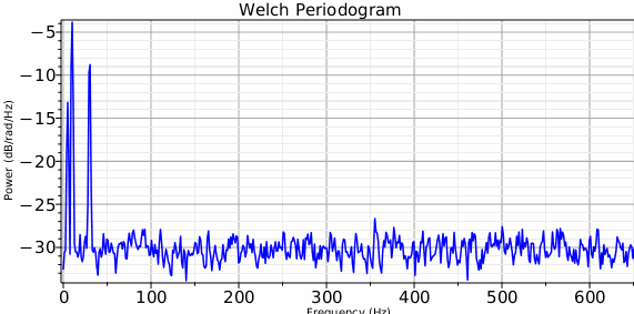Now, apply Welch's method with an appropriate choice of parameter values to return a record with the Vectors for the power spectrum and frequencies, along with the periodogram: