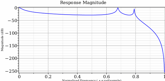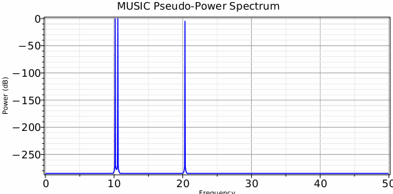 The MUSIC command performs the Multiple Signal Classifier (MUSIC) Method on a signal, which estimates frequencies present in a noisy signal by computing the eigenvalues of the autocorrelation matrix and separating them into signal-subspace eigenvalues and noise-subspace eigenvalues. Consider, for an example, the following real-valued signal: