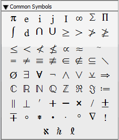 A palette is a collection of buttons representing items such as predefined symbols, expressions, operators, and Matrices. By clicking the buttons on the palettes, you can build or edit mathematical expressions without having to remember basic Maple command syntax.