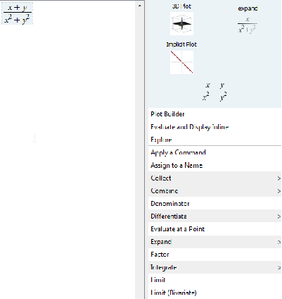 As you work, Maple dynamically generates context-sensitive options for the current object or expression. The actions are available in the Context Panel to the right of your document.