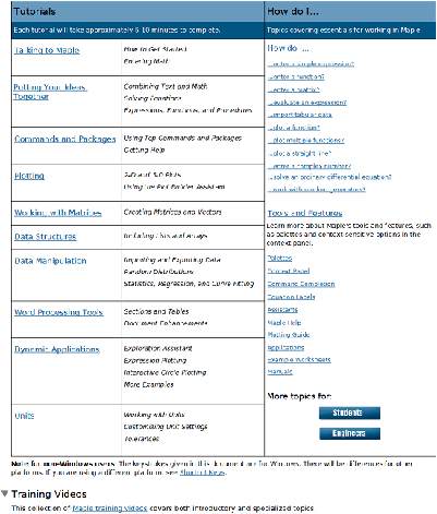The Maple Portal acts as a starting place for any Maple user. The Maple Portal includes tutorials on topics such as Plotting and Data Manipulation. From there, navigate to pages with more information for Students and Engineers.