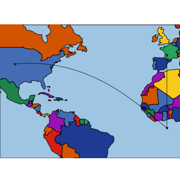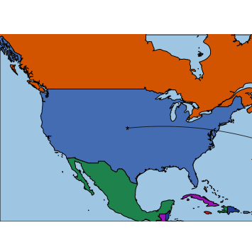 If p1 and p2 are given, both p1 and p2 must be lists of either two or three elements. The first element is the longitude (x-coordinate in the Geographic projection), and the second element is the latitude (y-coordinate in the Geographic projection). The optional third element is a string label for the point.