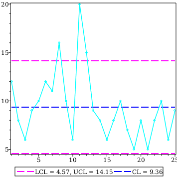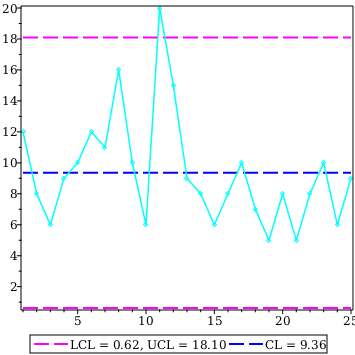 controllimits=deduce or [realcons, realcons] -- This option specifies the values for the control limits. The first element is the value of the lower control limit. The second element is the value of the upper control limit. For data with variable sample size, the value of this option must be a list of control limits for each sample. If this option is set to deduce (the default value), the control limits are computed based on the data.