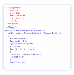 C# joins C, Java, Fortran, Visual Basic, and MATLAB® as a new target language for code generation.  Using the code generation tools, Maple expressions and programs can easily be converted to royalty-free source code.