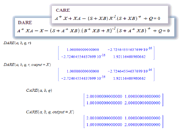 The Maple CARE and DARE solvers for continuous and discrete algebraic Riccati equations are enhanced with high-precision solvers that allow you to get solutions beyond IEEE double precision. These kinds of equations are important for many applications, and are particularly useful in control design.