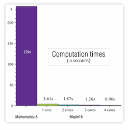 Maple takes advantage of the full processing power of your computer, automatically detecting and using all available processor cores to perform many computations in parallel. You do not need to do any special programming, change any options, or even know how many cores your computer has! In Maple 15, many fundamental operations can be done in parallel, so your results are available much faster and you can tackle larger problems.