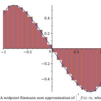 The RiemannSum(f(x), x = a..b, method = midpoint, opts) command calculates the midpoint Riemann sum of f(x) from a to b. The first two arguments (function expression and range) can be replaced by a definite integral.